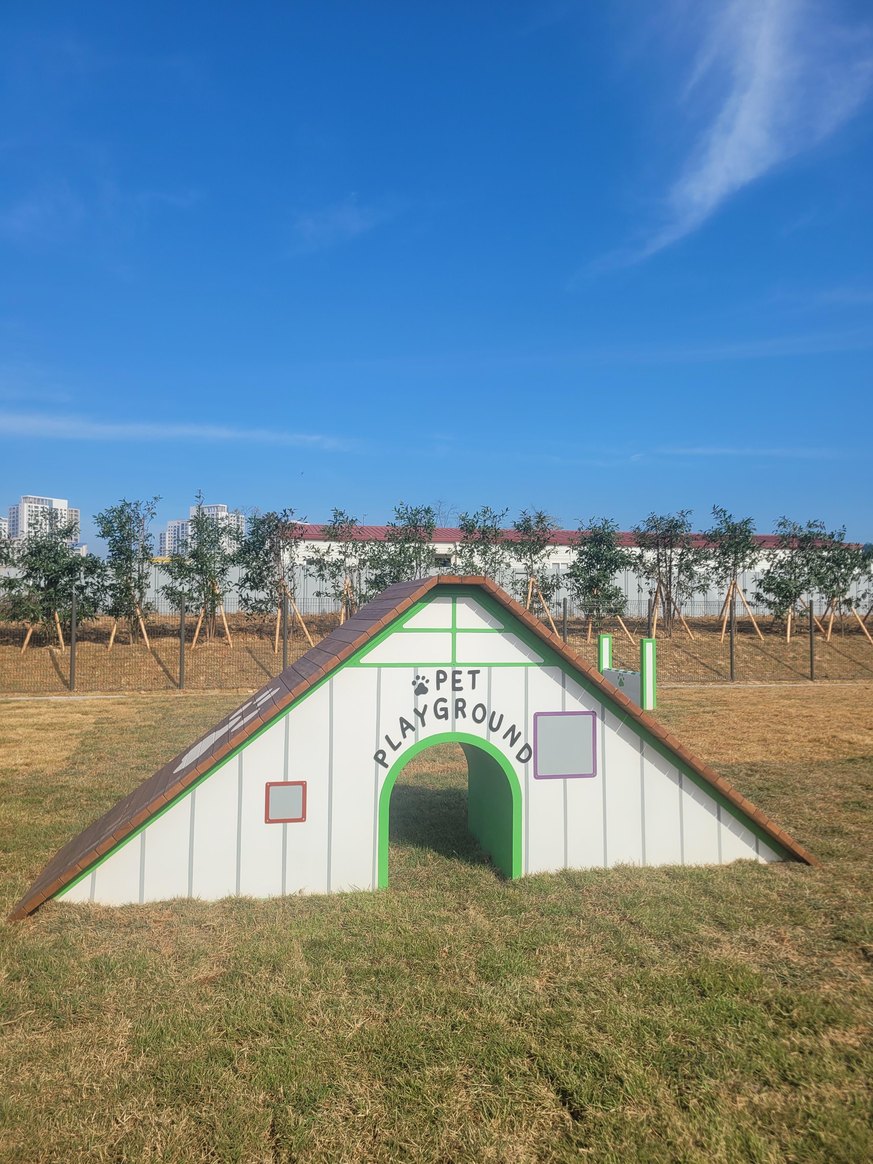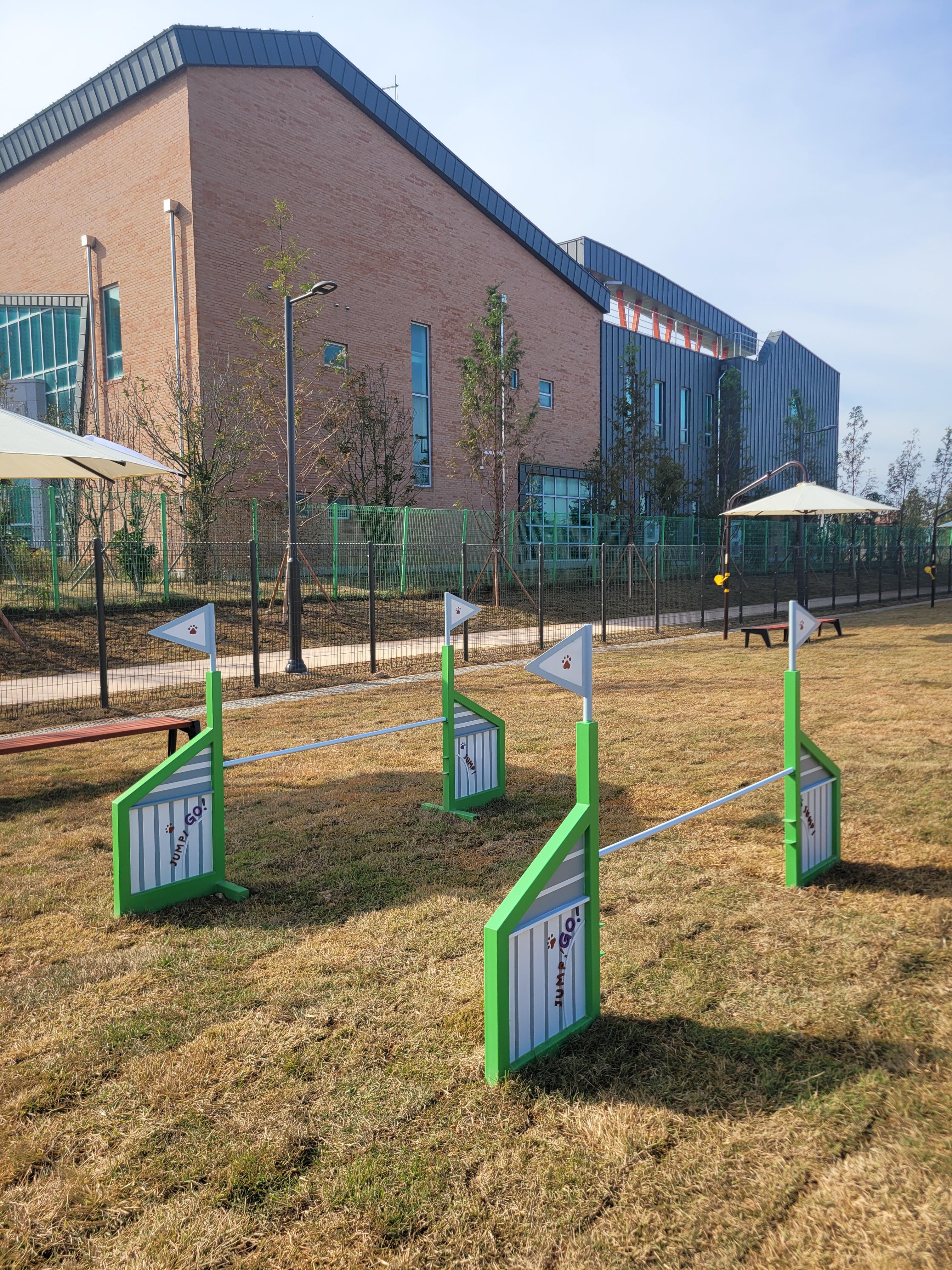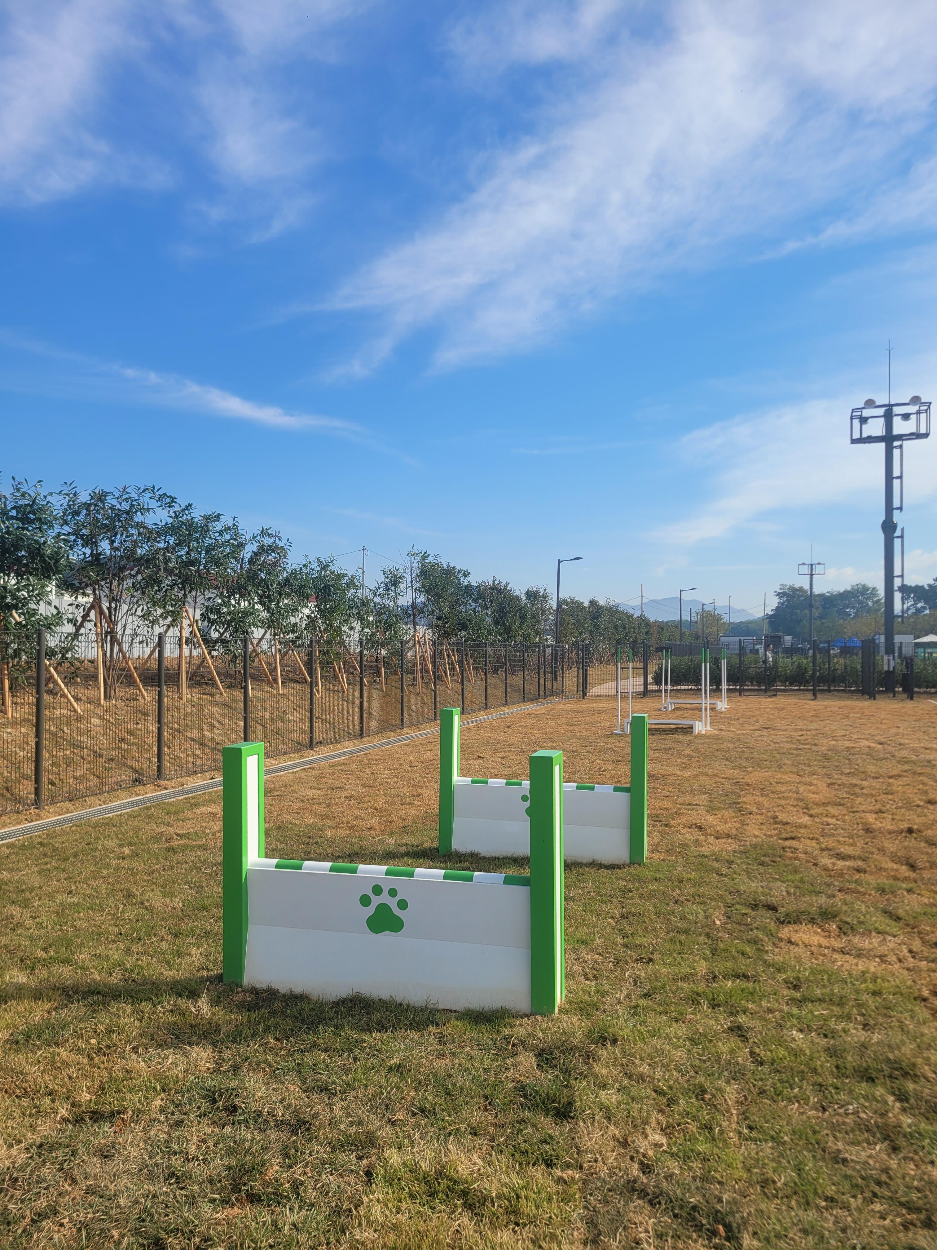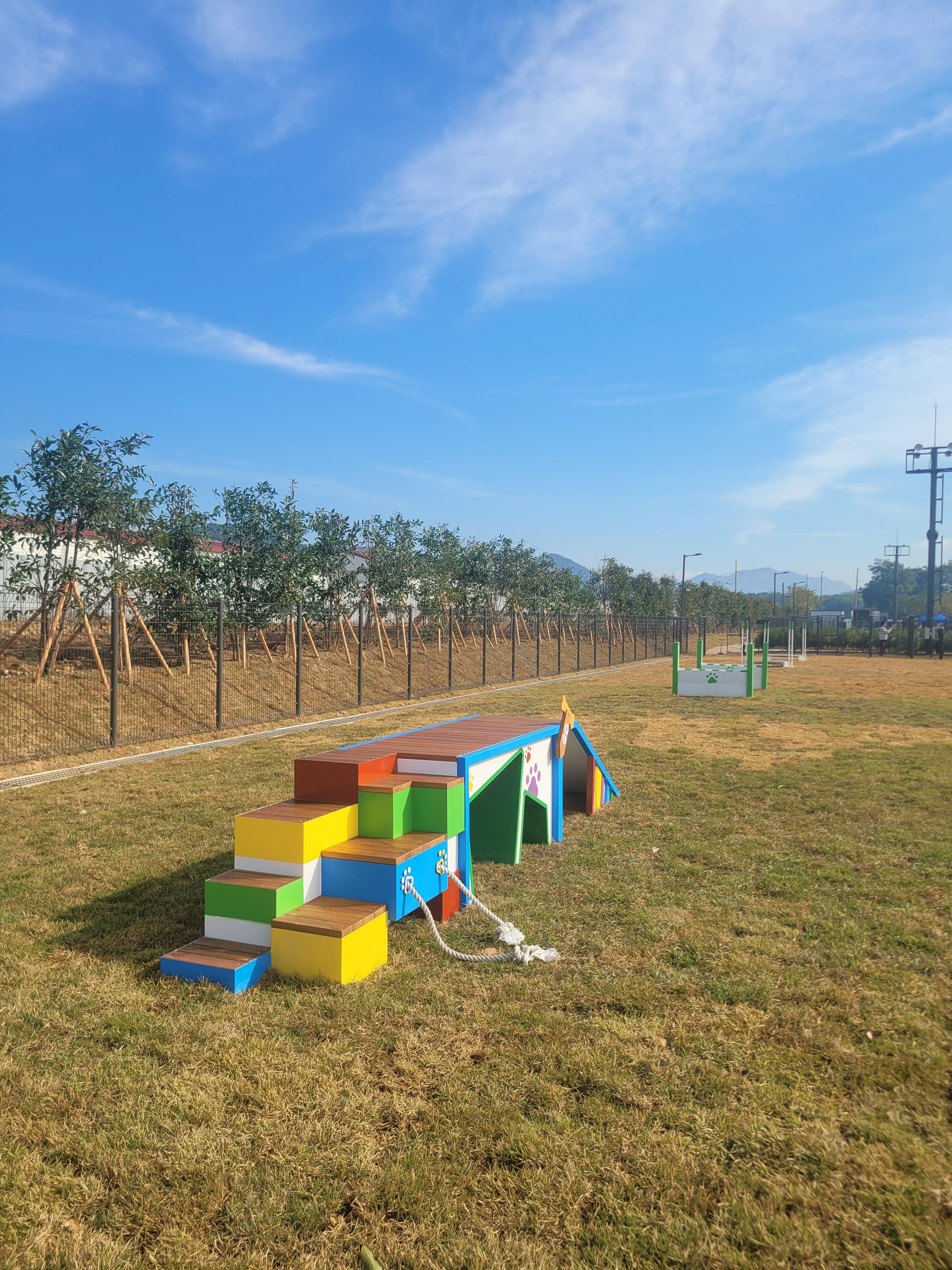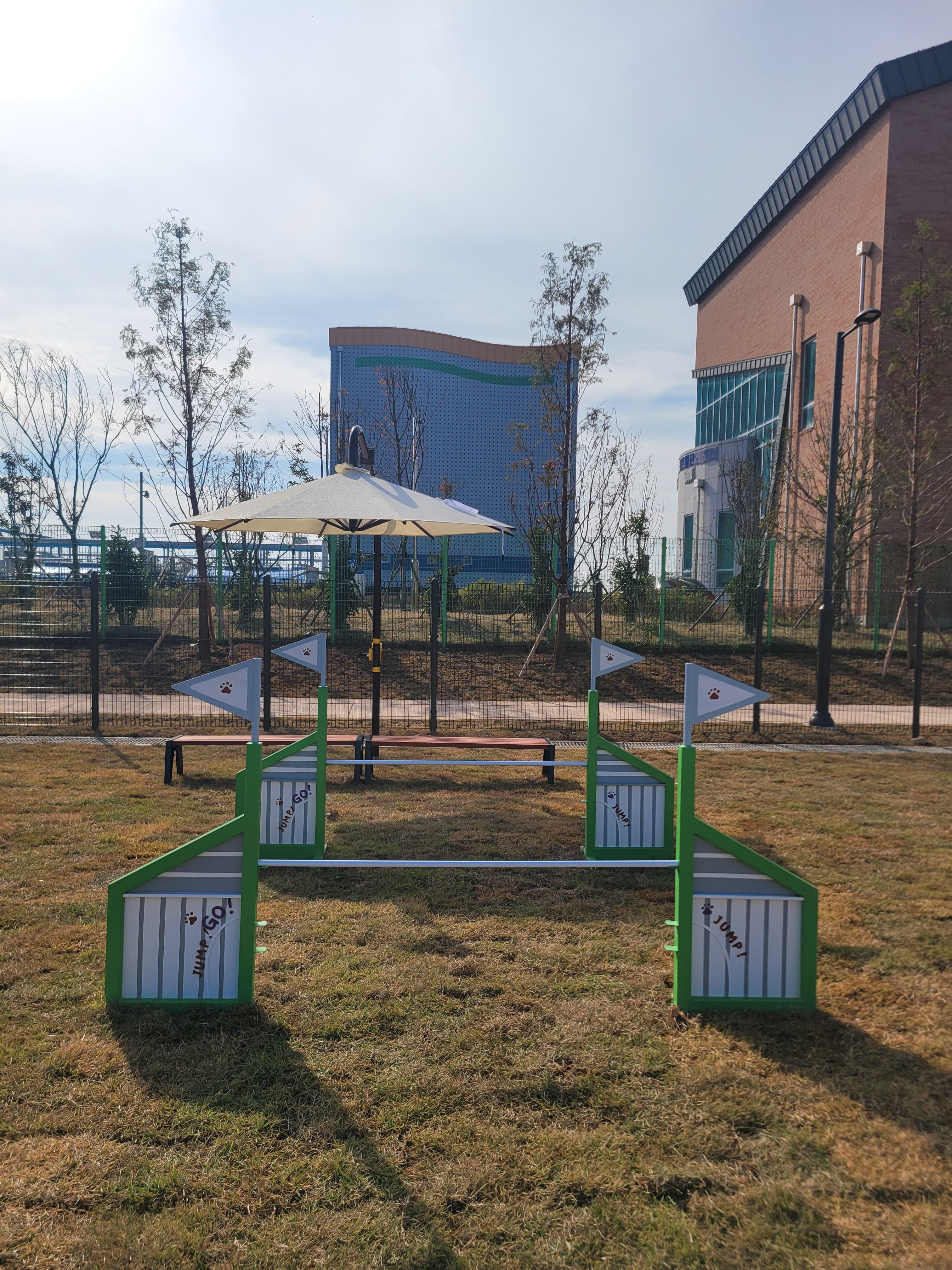 견주가 쉴 수 있는 벤치와 파라솔, 강아지들이 놀 수 있는 다양한 놀이시설, 음수대, 배셜물 쓰레기통, 격리장, 강아지 벤치 등이 설치되어 있었다. 소형견 놀이터보다는 강아지 놀이시설 더 크고 난도가 있어 보였다.