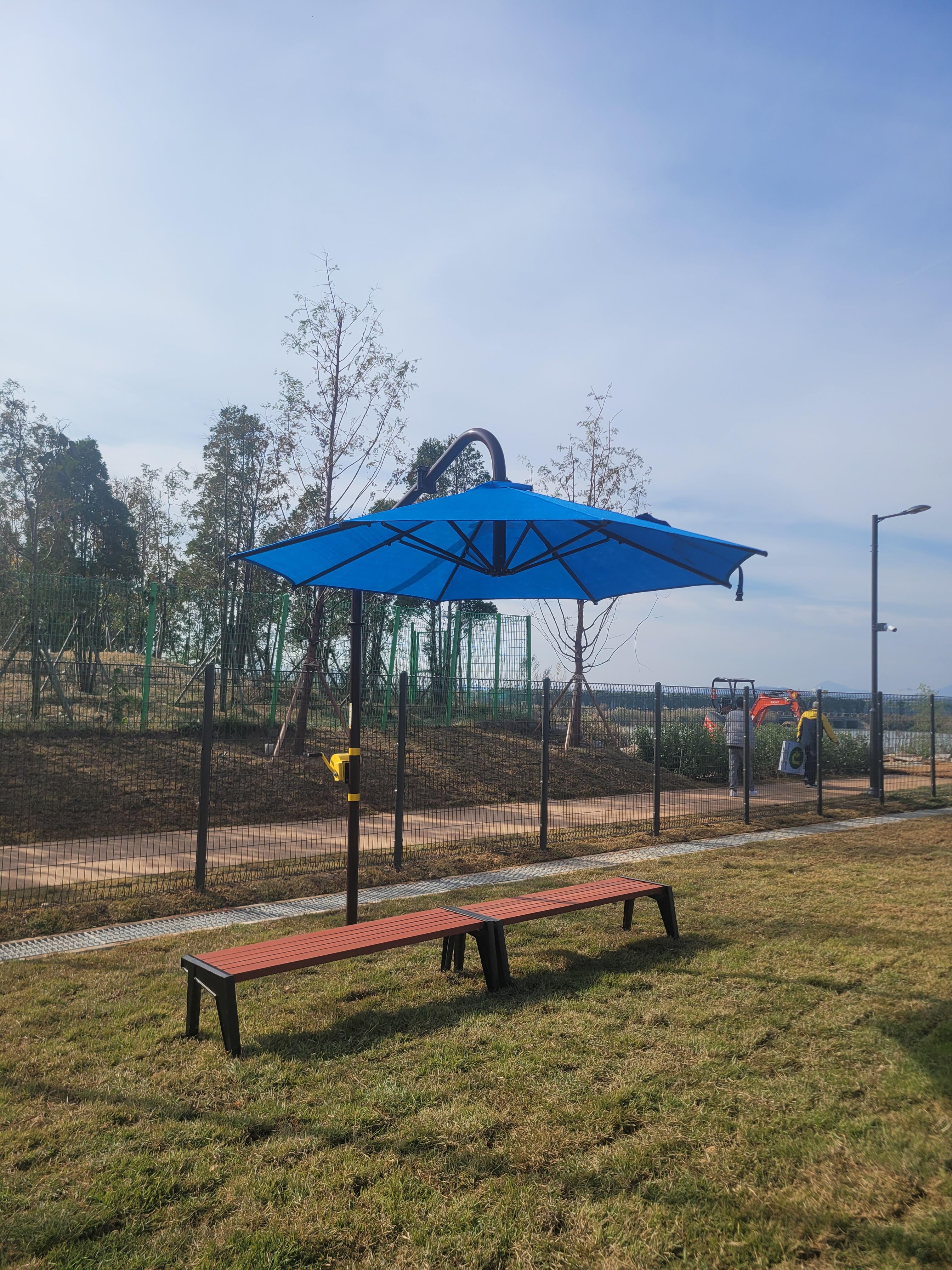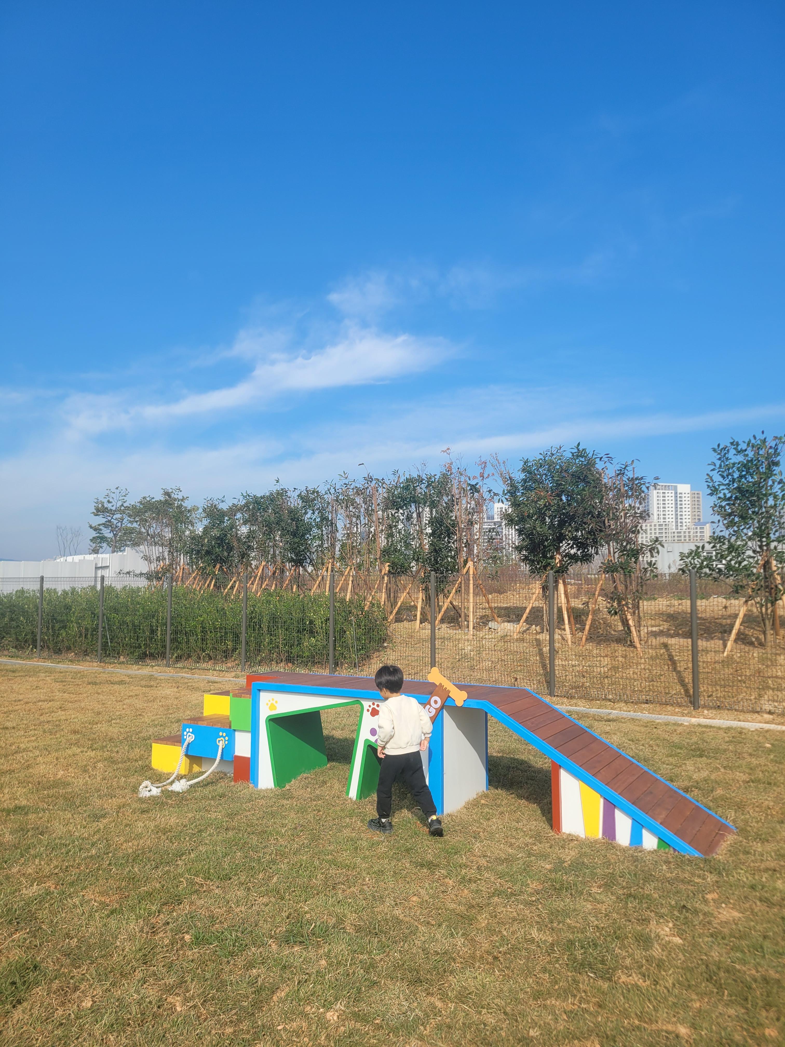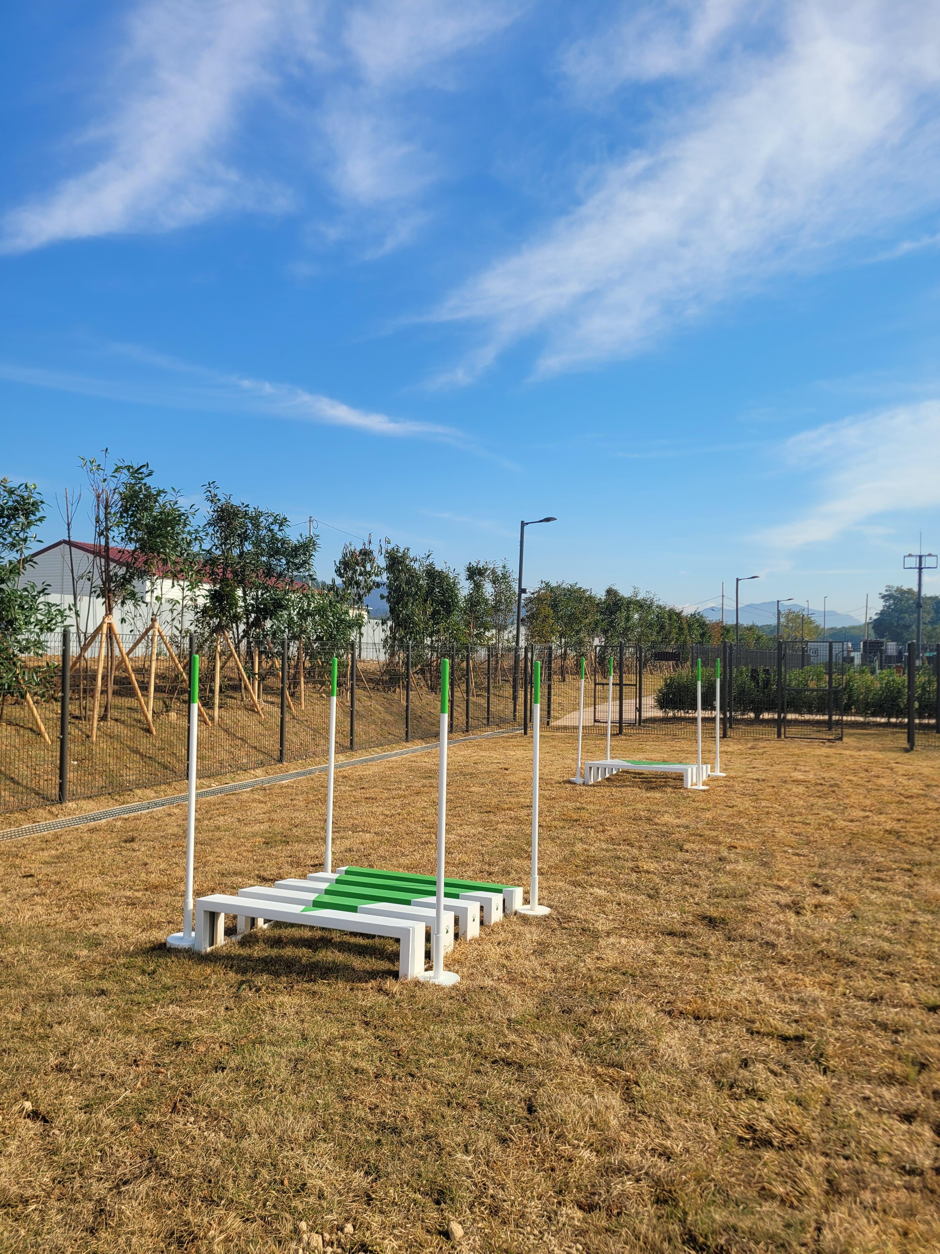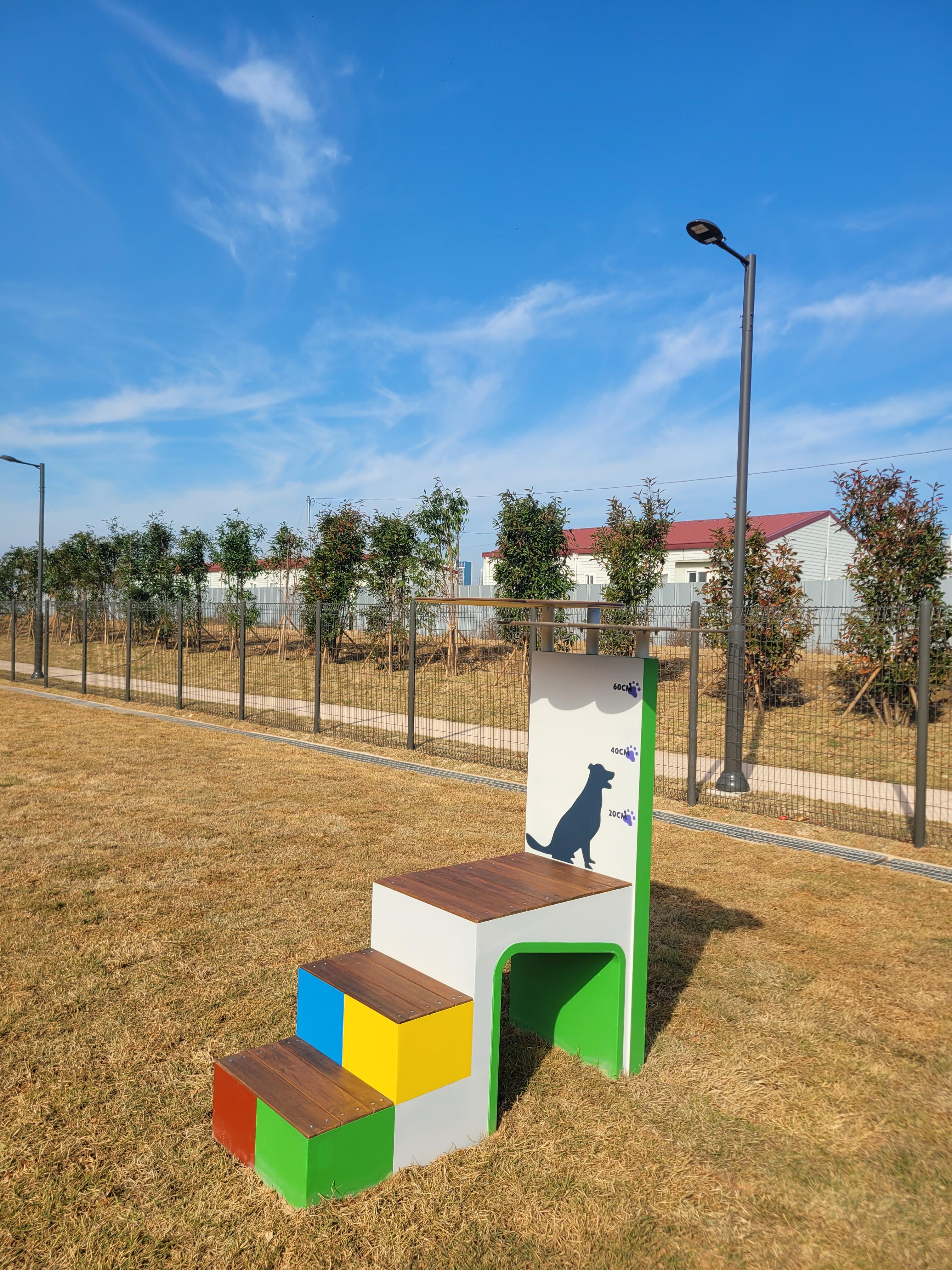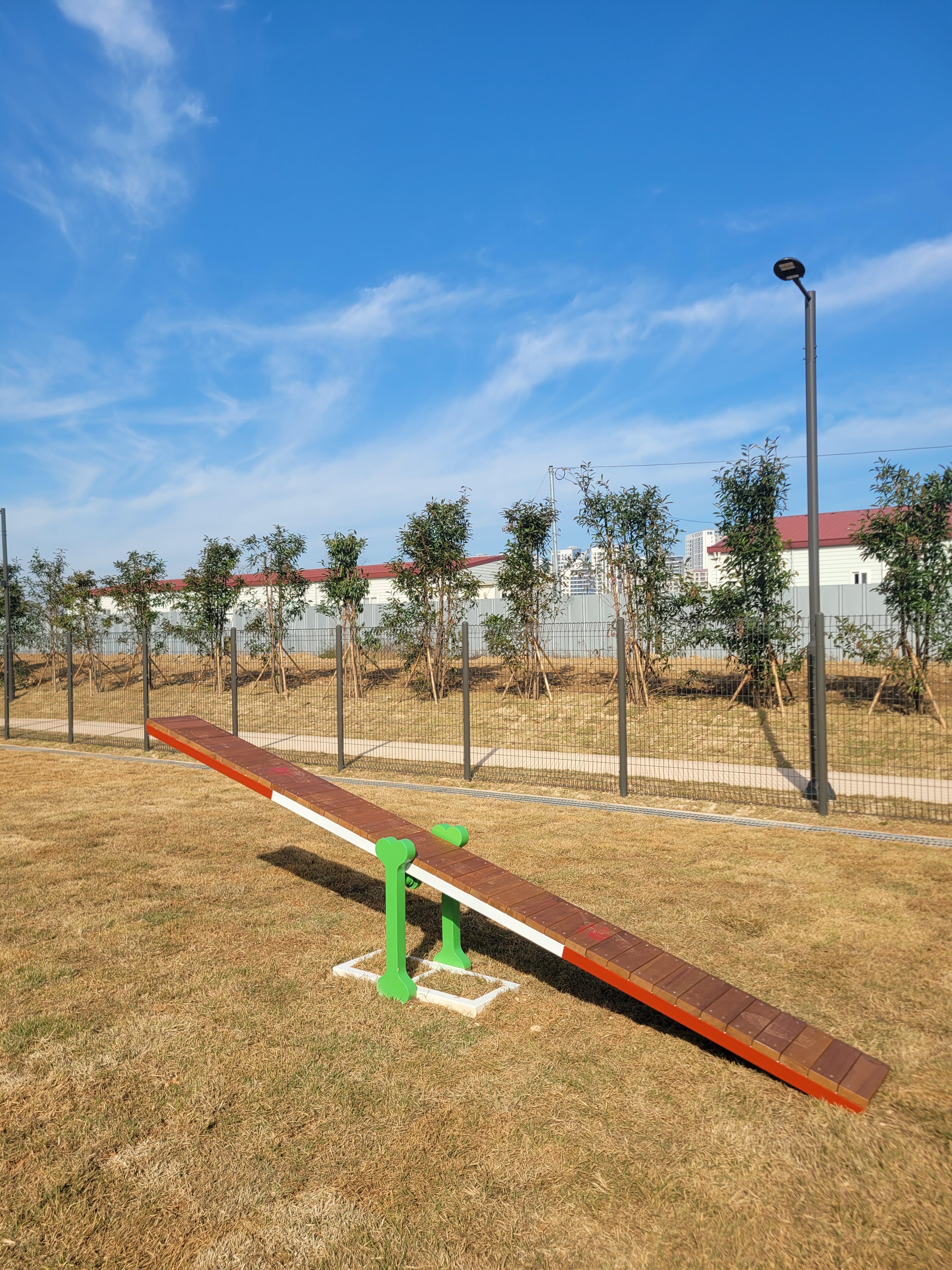 견주가 쉴 수 있는 벤치와 파라솔, 강아지들이 놀 수 있는 다양한 놀이시설, 음수대, 배셜물 쓰레기통, 격리장, 강아지 벤치 등이 설치되어 있었다. 소형견 놀이터보다는 강아지 놀이시설 더 크고 난도가 있어 보였다.