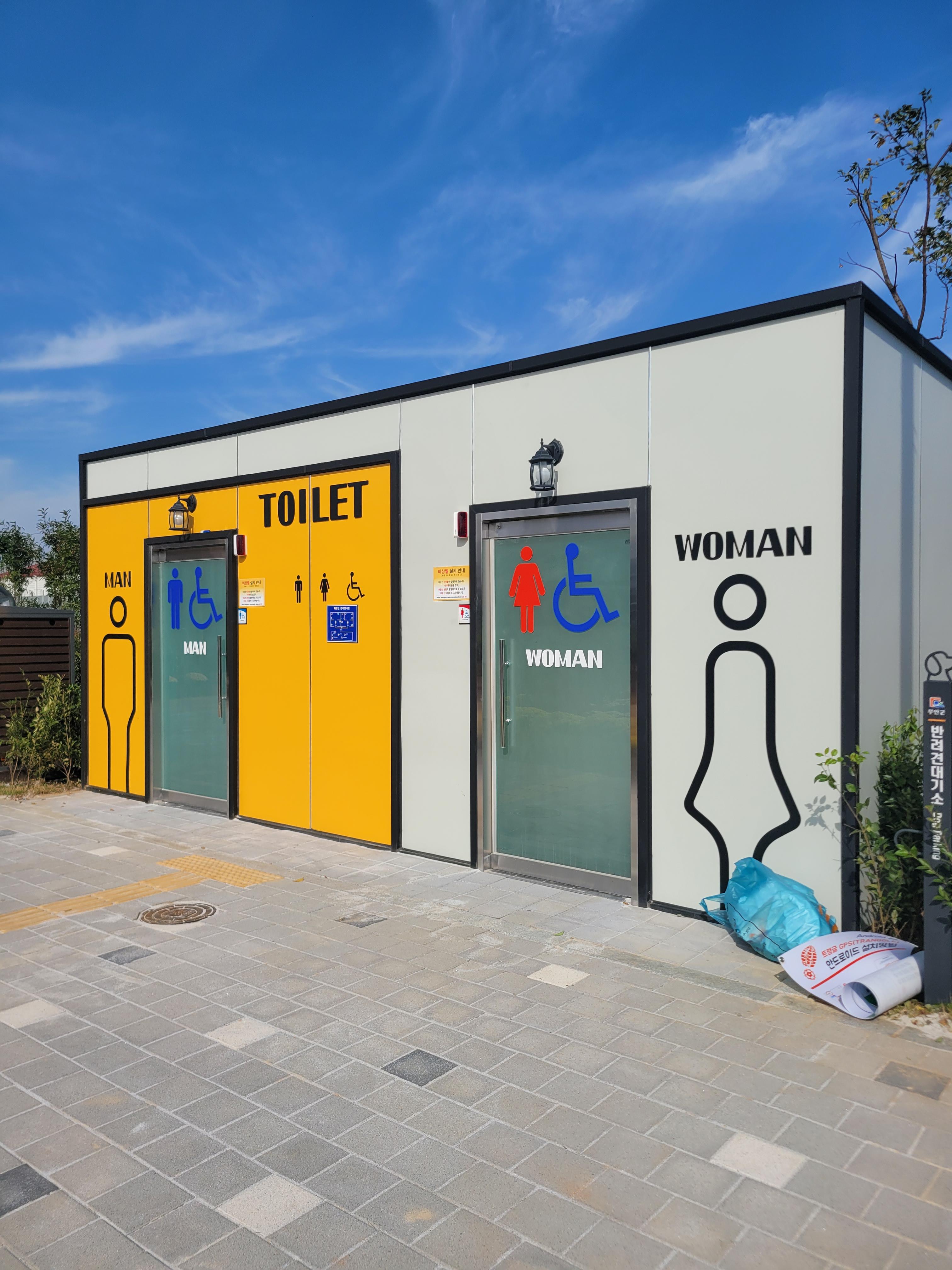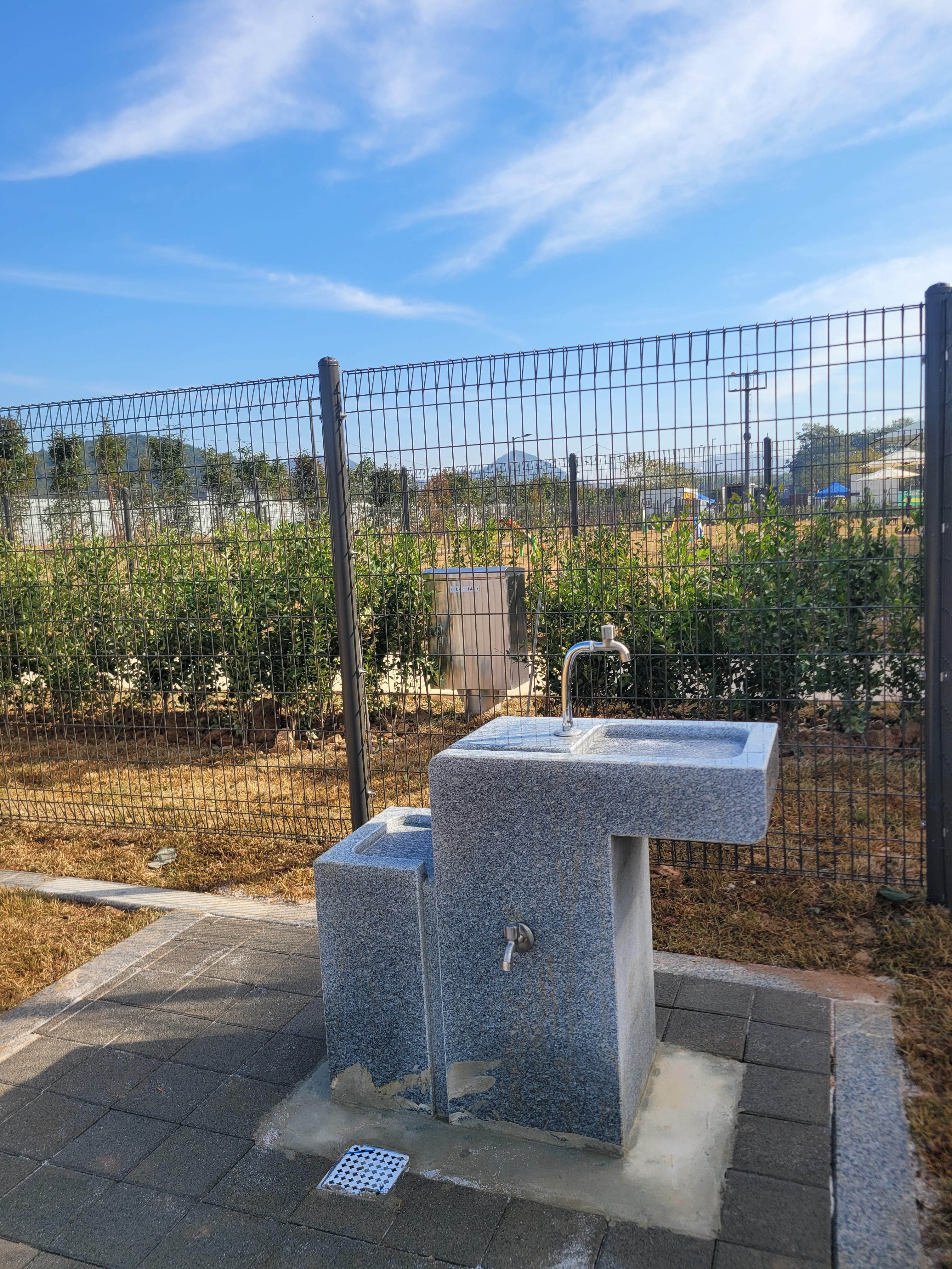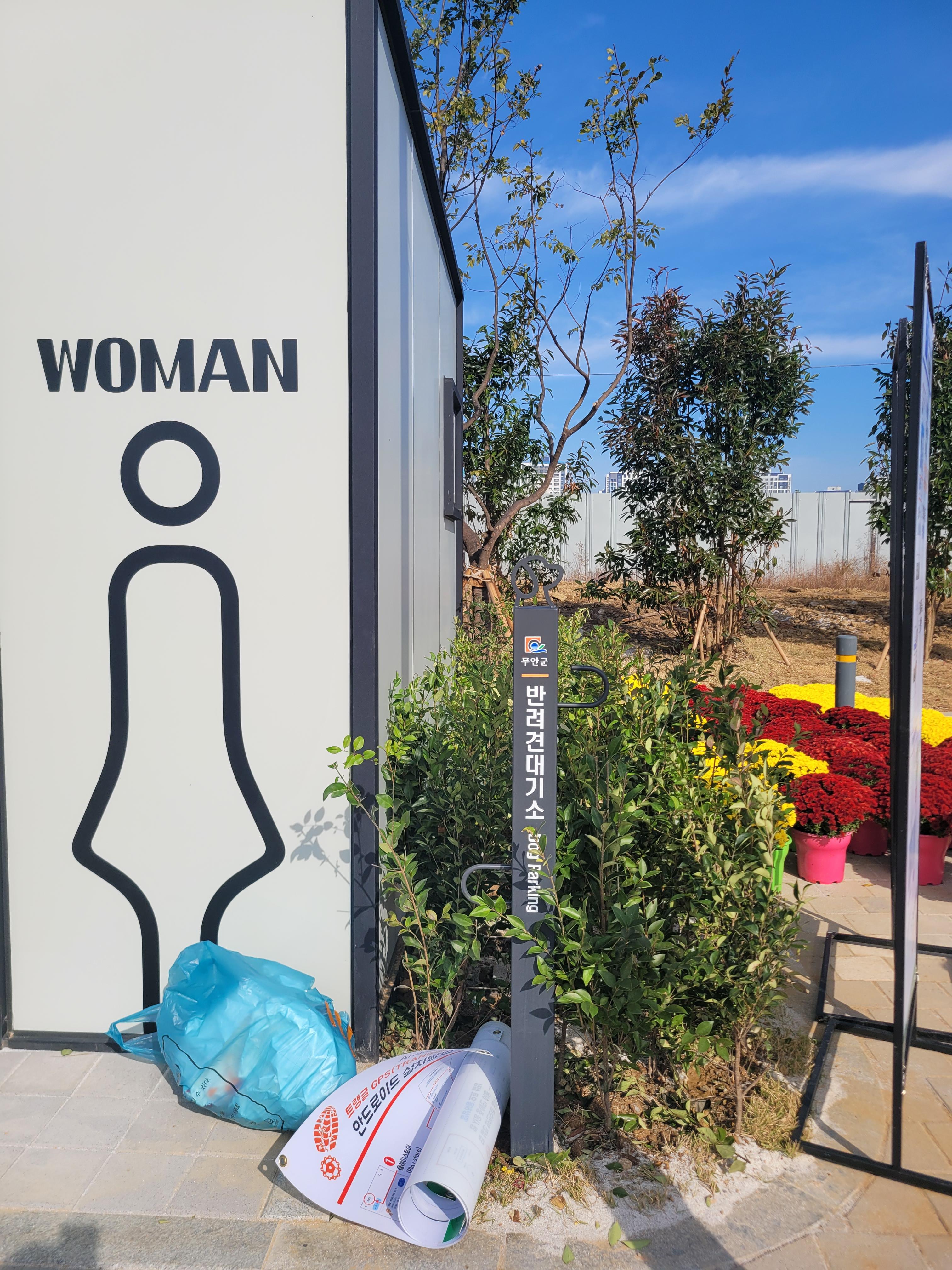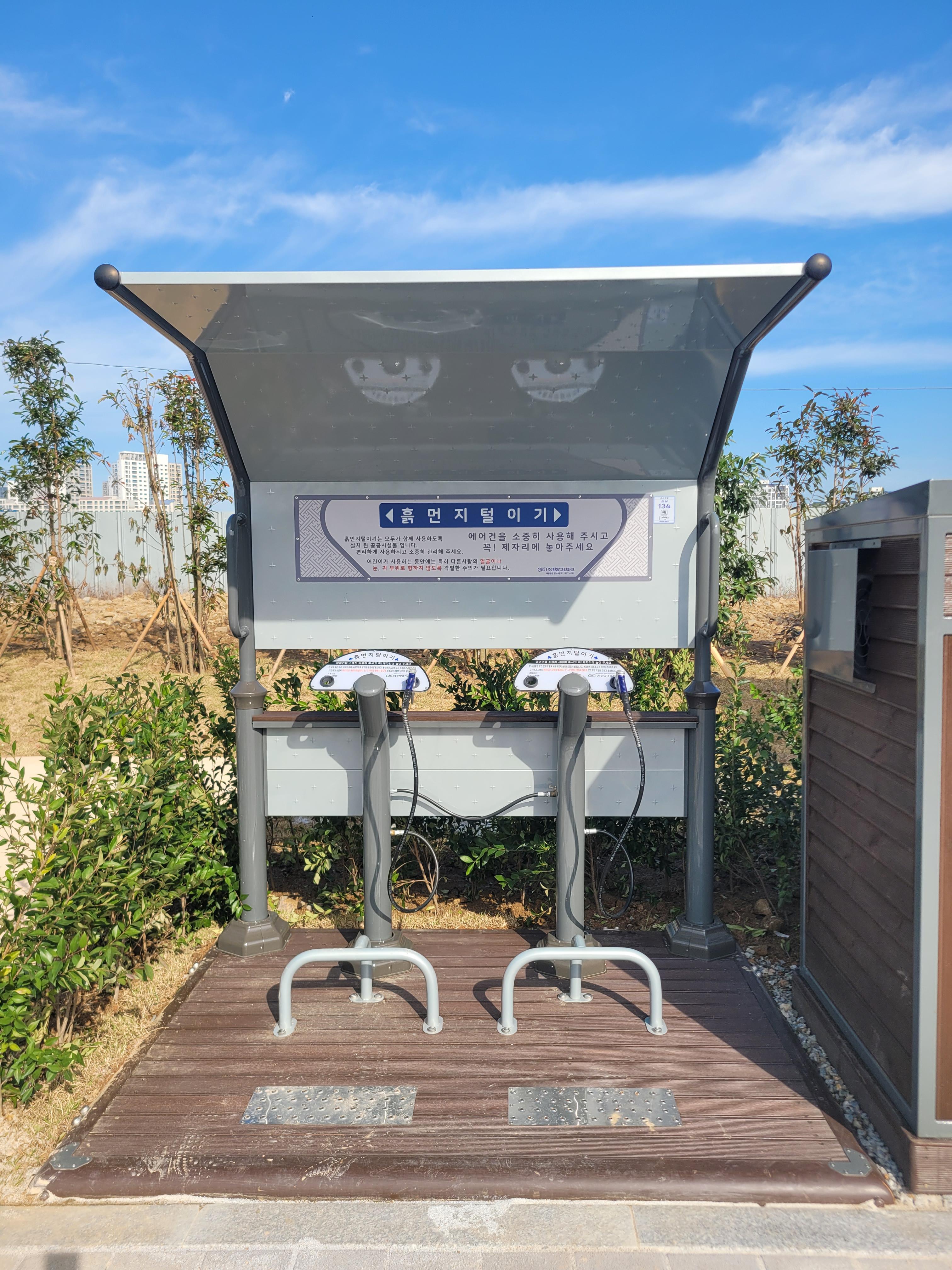 주차장을 조금 지나면 화장실과 벤치가 있다. 화장실은 반려동물놀이터답게 입구에 반려견대기소가 있었다. 강아지가 있어도 편하게 화장실을 갔다 올 수 있을 것 같다. 화장실 옆에는 흙먼지를 털 수 있는 에어건이 있었다. 놀이터에서 신나게 논 후 집에 가기 전에 먼지를 털면 참 좋을 것 같다.