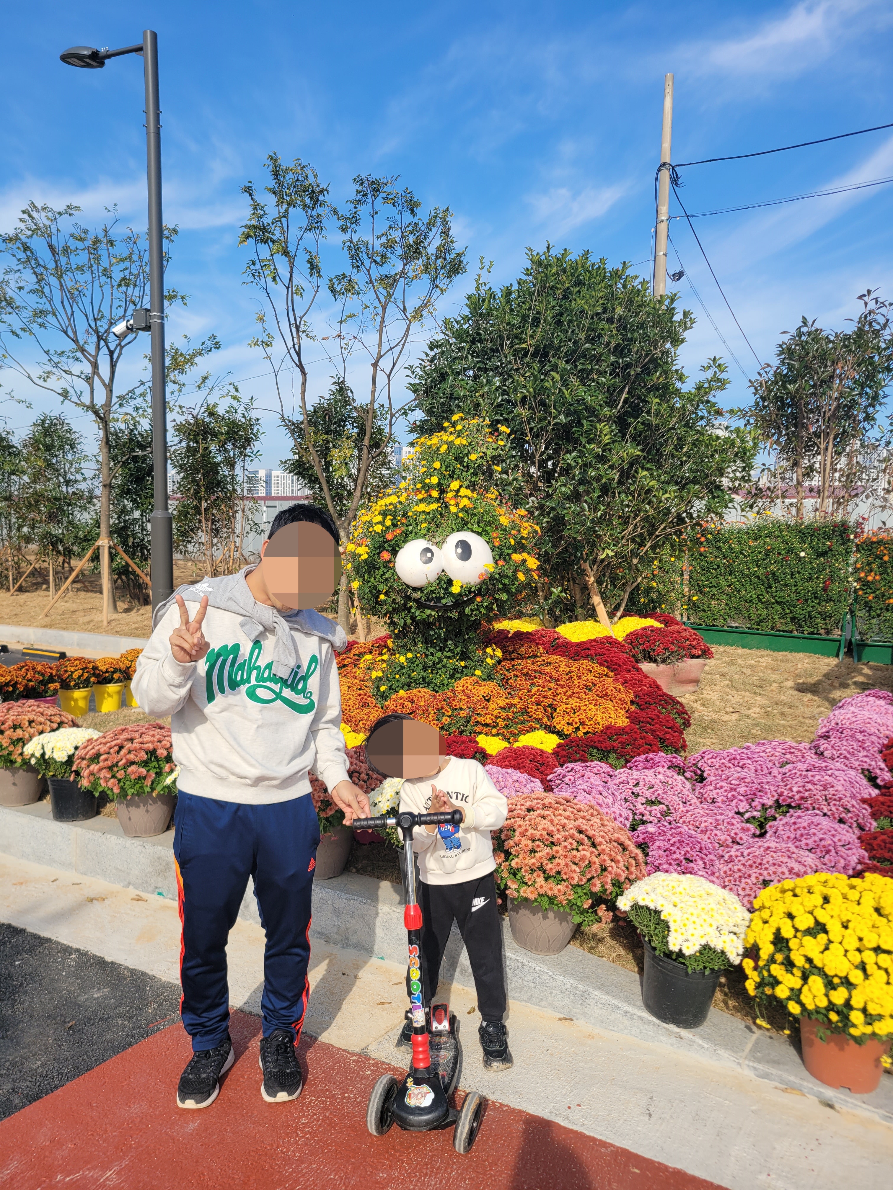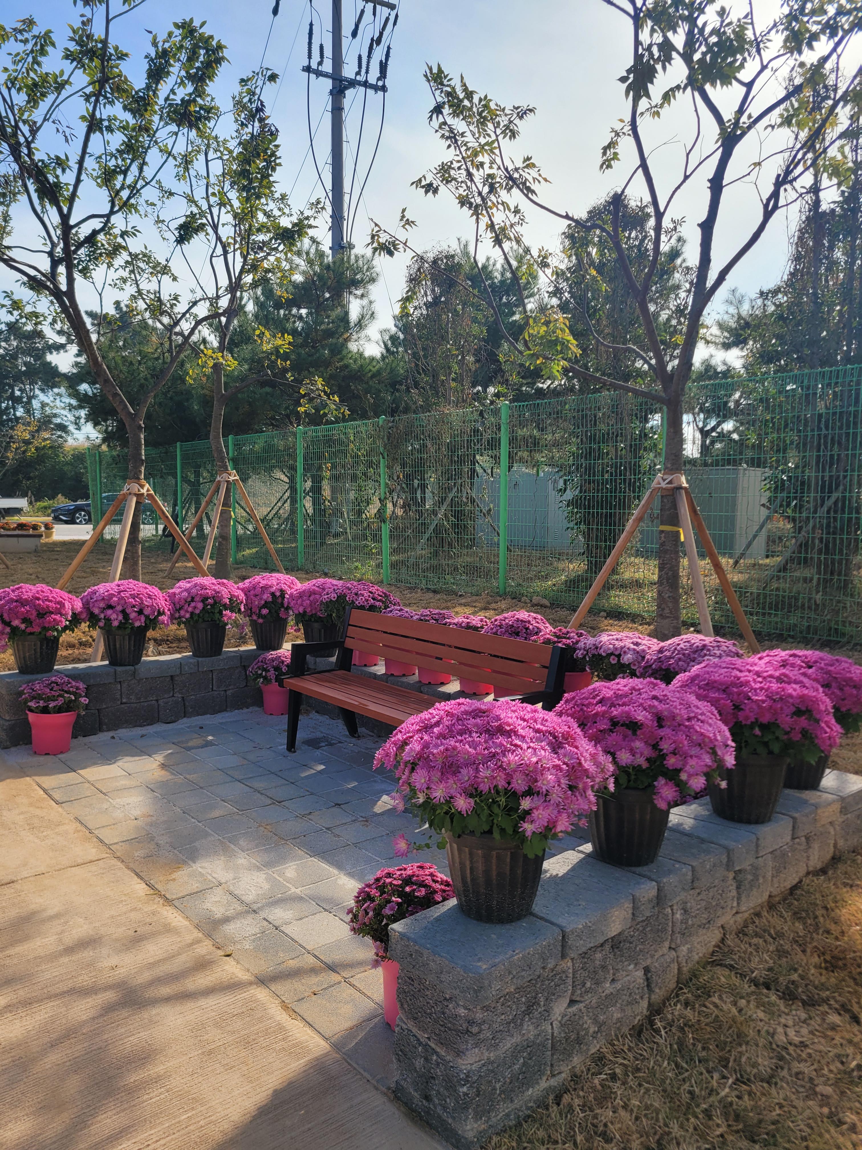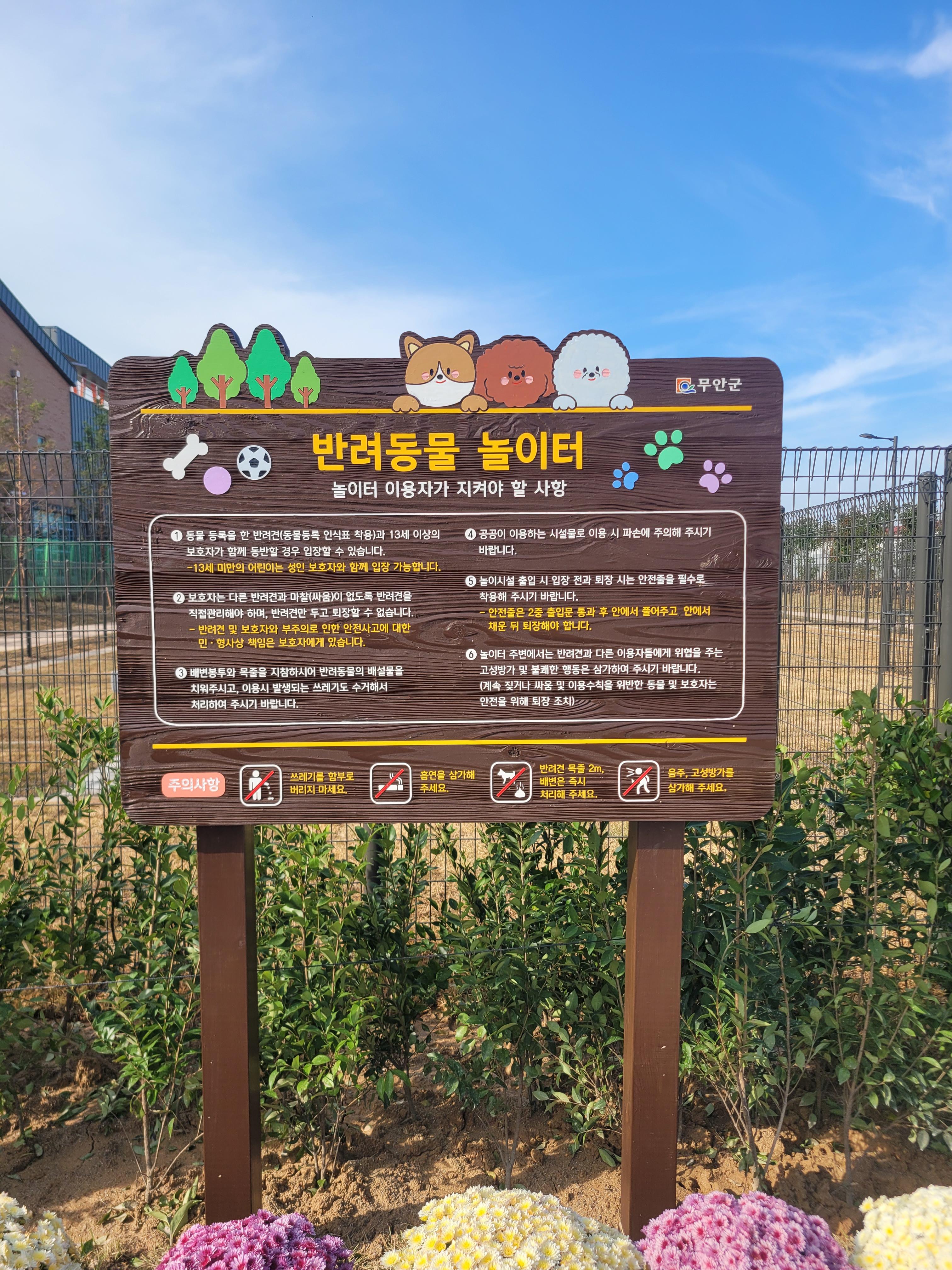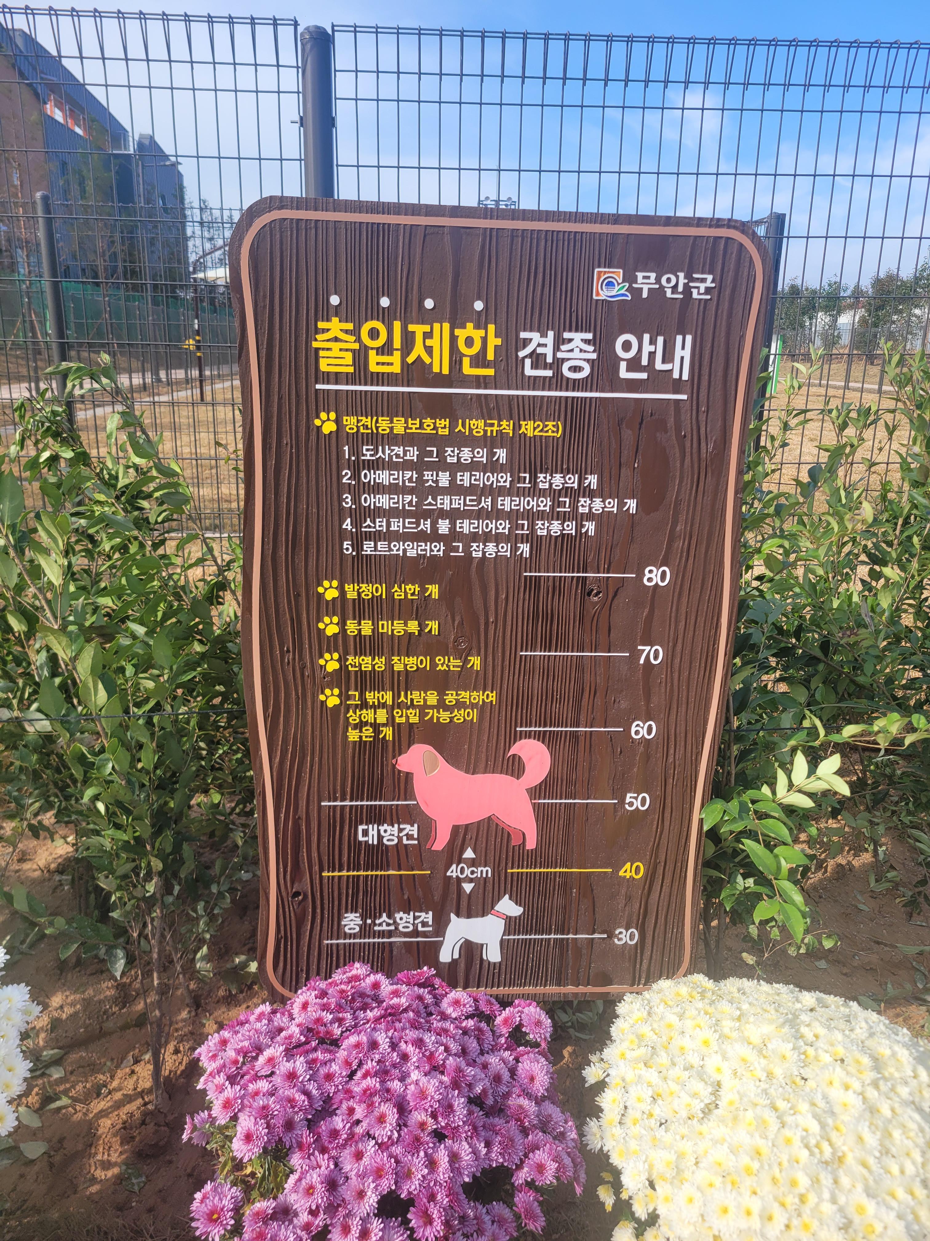 반려동물 놀이터: 무안으로 오개 입구에 이렇게 예쁘게 푯말을 만들어 두었다. 입구랑 길 쪽에는 국화로 사진을 찍거나 쉴 수 있는 장소도 있었다. 입구를 지나면 주차장이 있는데, 20대 정도 무료로 주차할 수 있을 것 같다.